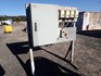 Switch board/control panel, custom made, was used to run a feeder & conveyors & hydraulic pack, etc., 1 x 415 volt & 1 x 240 volt outlets, multiple circuit breakers and safety switches, mounted on a steel frame, fair working condition.