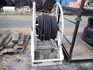 Hose reel, custom made from marine grade alloy, 1300mm diameter x 540mm wide inside, with a lock, on a base frame with forklift pockets, includes 2 lengths of multi spiral hydraulic hose 1 inch ID with quick couplers, in good condition.