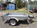 Trailer single axle with cage, Tymeyer brand 1995 build, 750Kg ATM, Vin plated, 50mm hitch, 175R14 tyres, spare tyre, 6x4 (1200mm x 1800mm) cage 1800mm high, suit carting potted plants or furniture etc., fair condition.